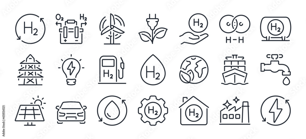 Fotografía H2 hydrogen electrolysis editable stroke outline icons set isolated on white background flat vector illustration