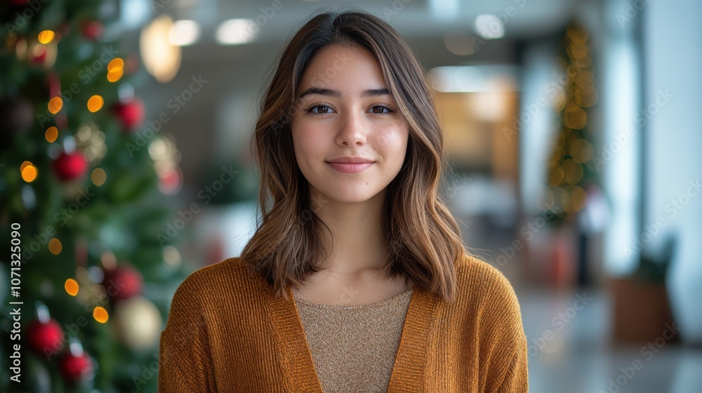 Fotografía Half body shot of a Hispanic woman with shoulder-length brown hair, wearing a go