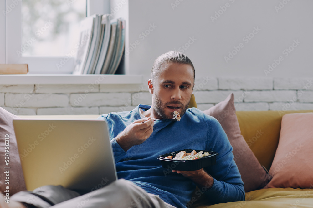 Fotografía Handsome young man eating lunch and looking at laptop while sitting on the couch