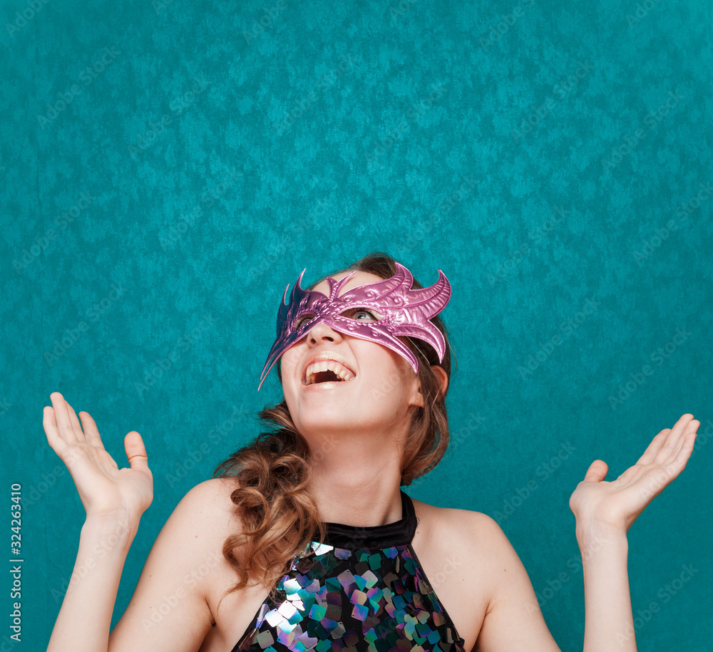 Fotografía Happy woman with pink mask laughs