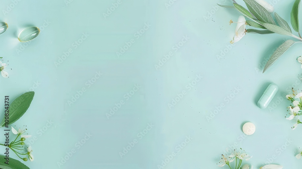 Fotografía Health-themed banner, soft teal background, single pill capsule, ample space for copy