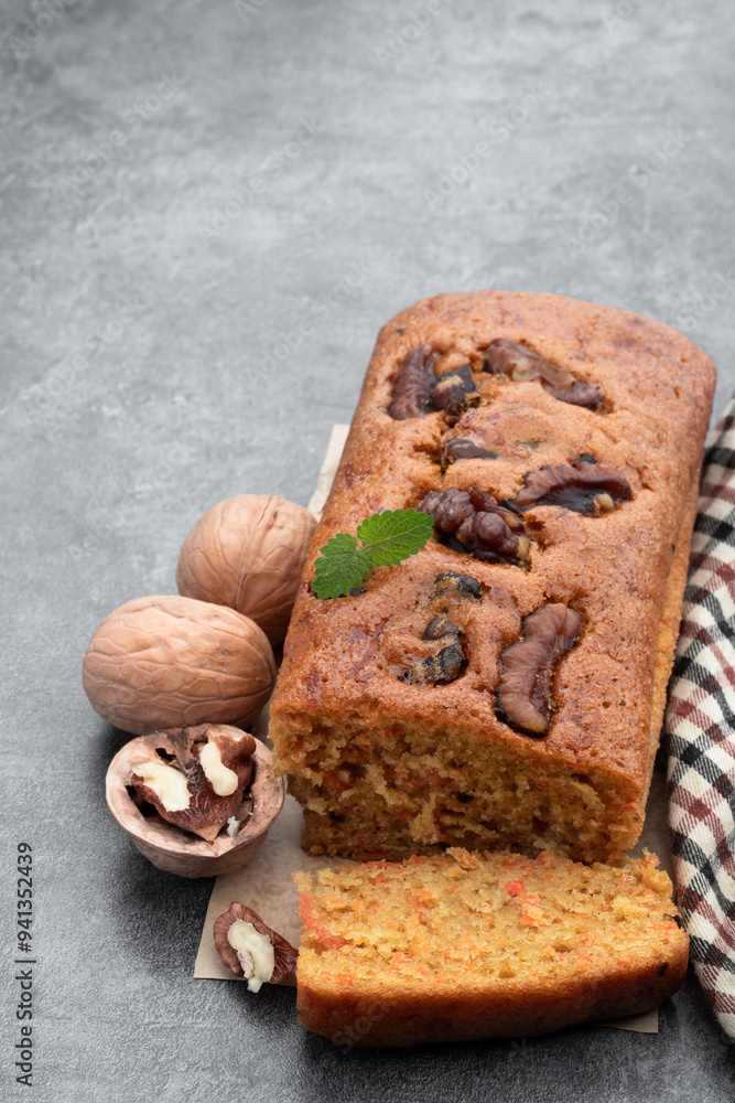 Fotografía Homemade carrot and walnut loaf cake on gray table