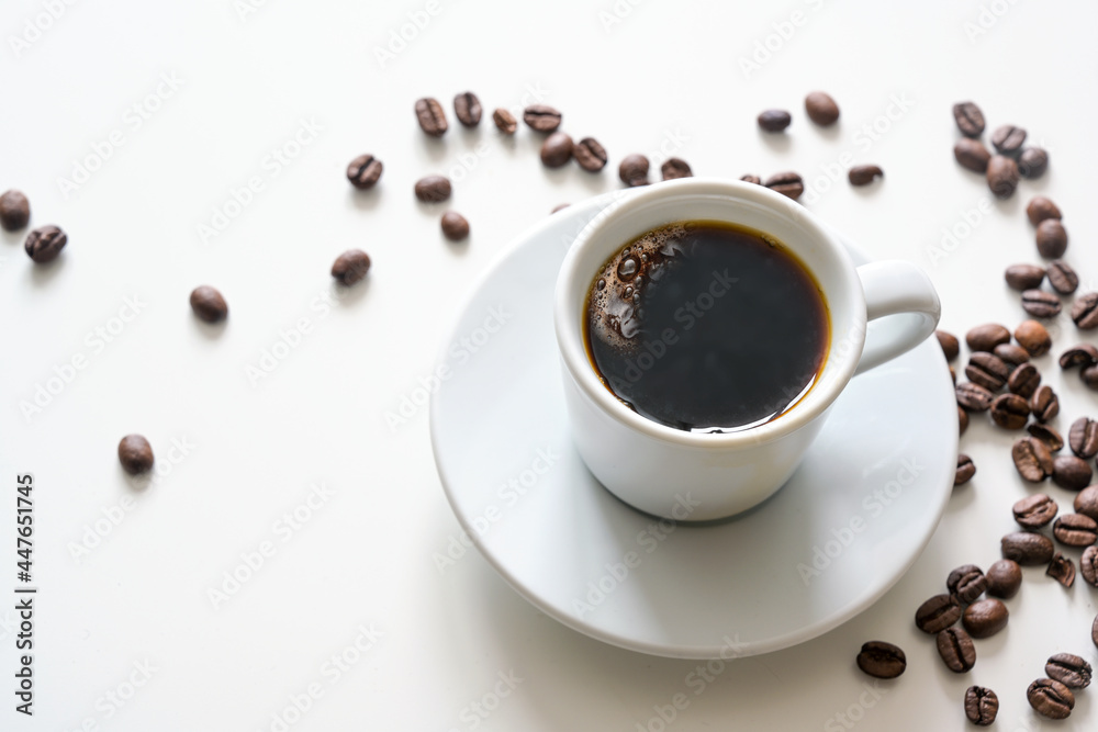 Fotografía Hot coffee, black and strong in a white cup on a bright table with some beans, c