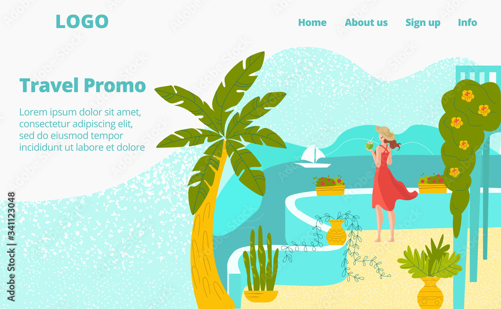Fotografía Hot tour travel for vacation at summer, woman at sea hotel terrace with palms, tourism web flat vector illustration