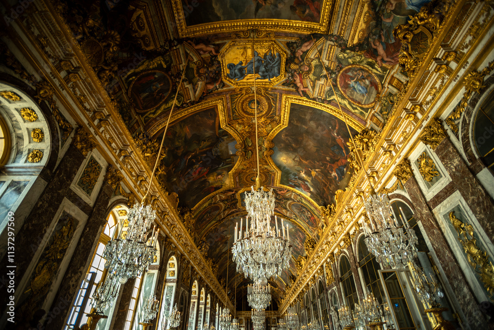 Fotografía Iconic Ceiling Frescoes and Chandeliers in the Hall of Mirrors of Versailles Pal