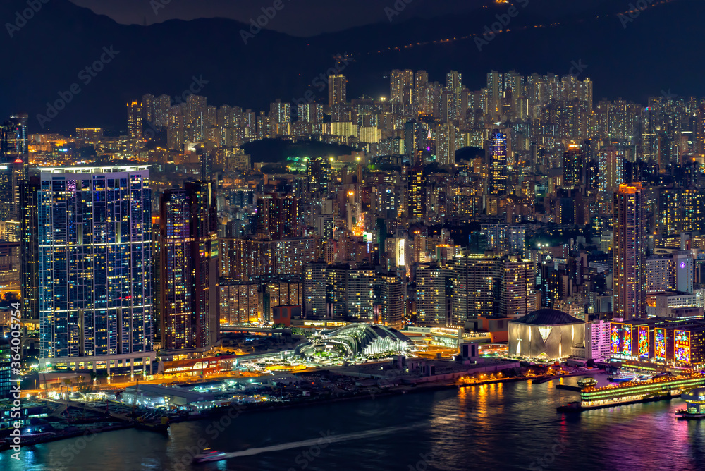 Fotografía Illumination of Light of Skyscraper Buildings at Christmas Night, Kowloon Island