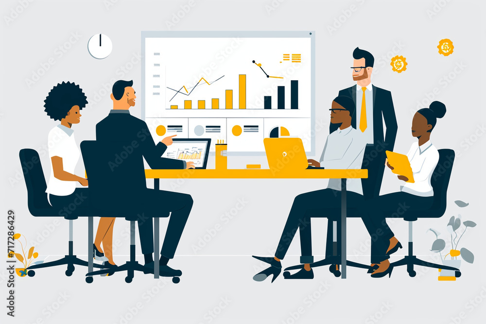 Fotografía Illustration of a financial review meeting with advisors and clients, Flat illus