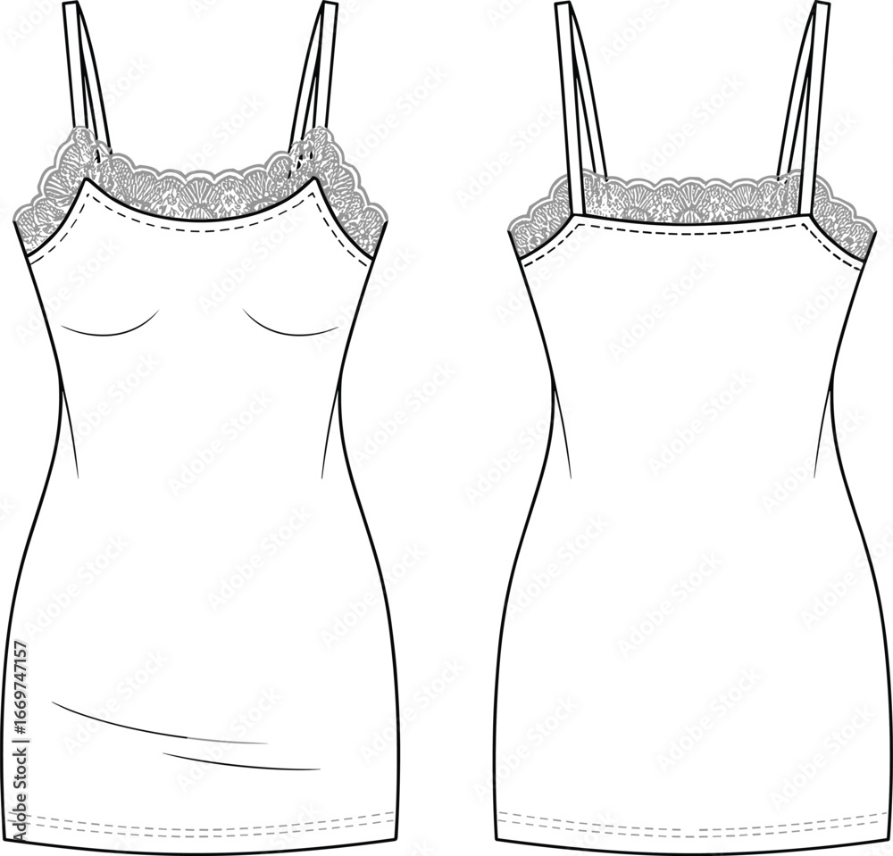 Fotografía Fashion technical flat sketch of women slip dress lingerie with lace trim neckline, spaghetti straps, nightwear clothing design vector apparel illustration