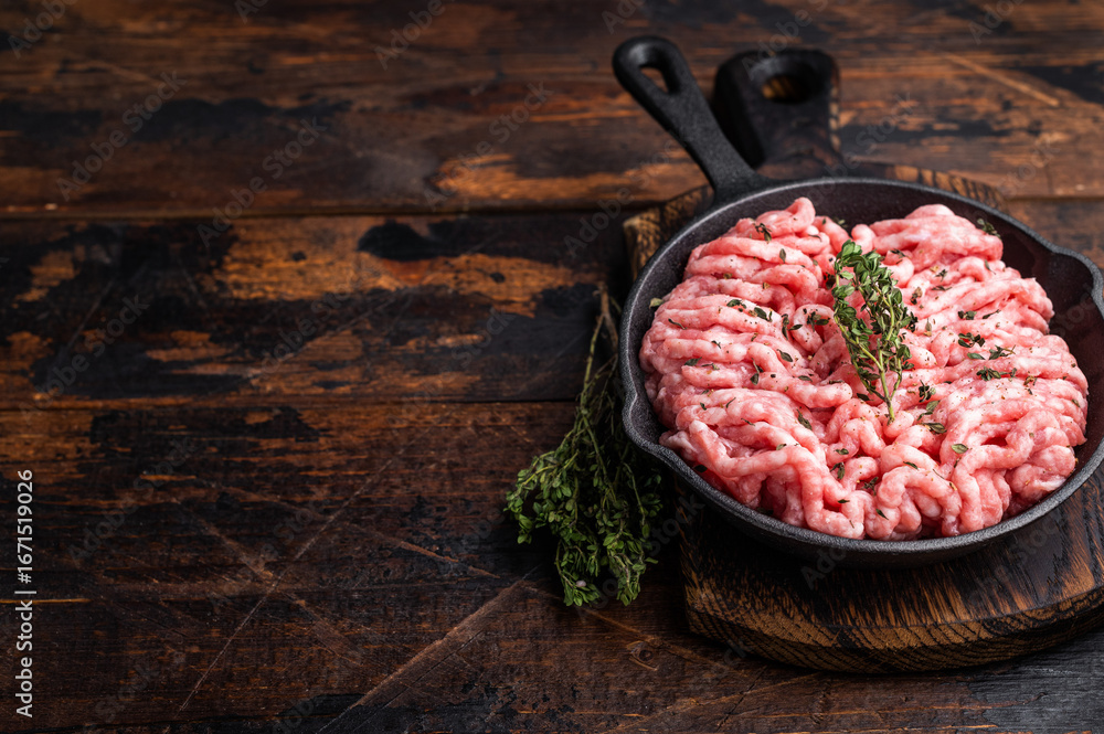Fotografía Ready for cooking raw ground pork and beef meat, fresh mince meat in skillet