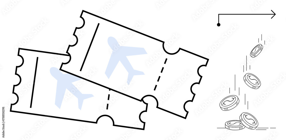 Fotografía Two airplane tickets next to falling coins and an arrow symbolizing travel costs