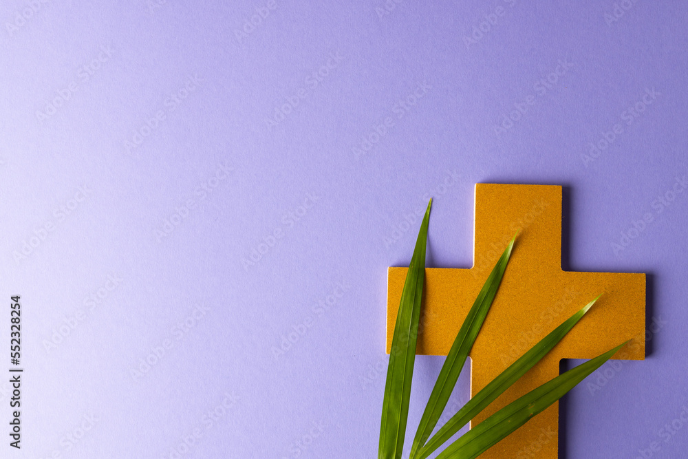 Fotografía Composition of christian ash wednesday cross and palm leaves on purple backgroun