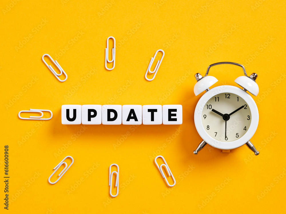 Fotografía The word update on cubes with alarm clock and paper clips