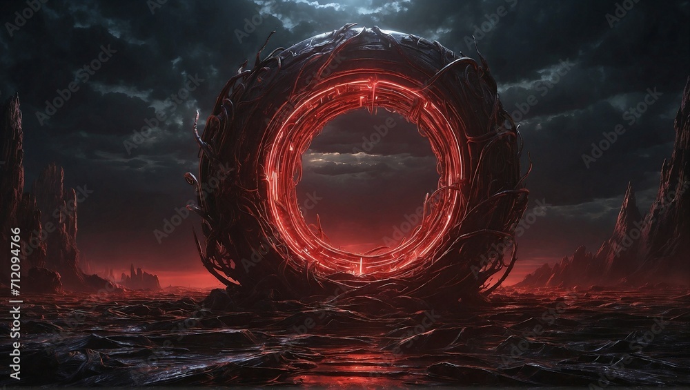 Fotografía In the depths of a dystopian wasteland, a chillingly ominous time portal looms, its hum vibrating with a sinister resonance