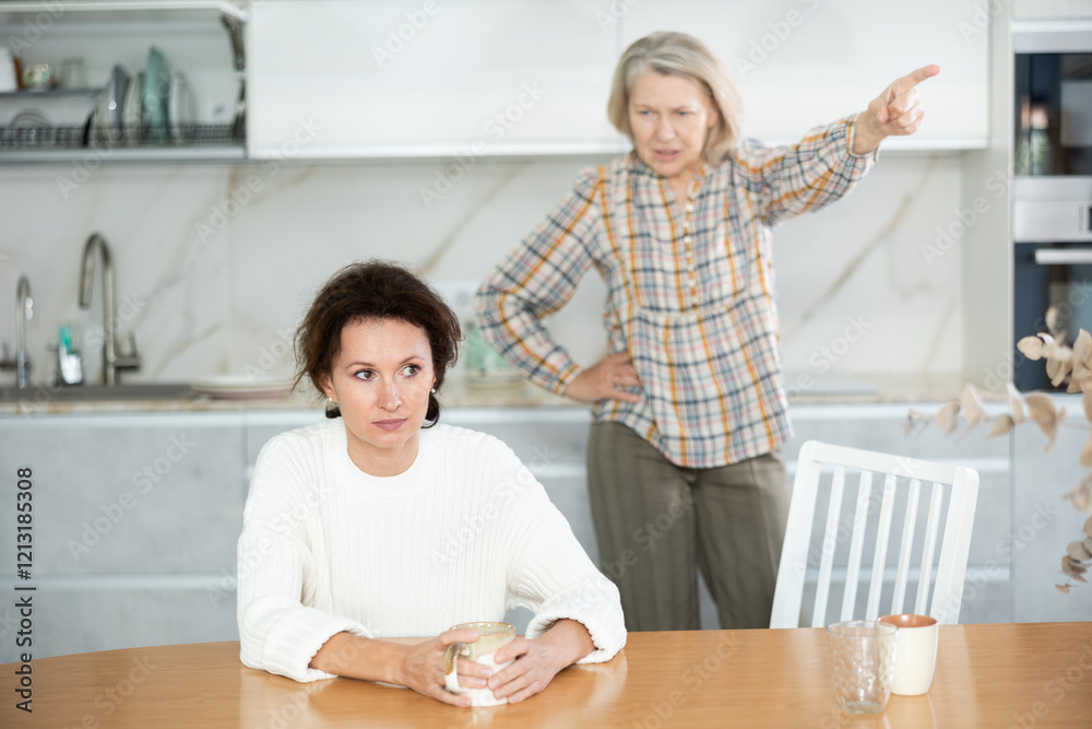 Fotografía Irritated elderly woman having quarrel with her daughter at home