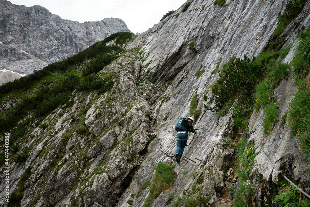 Fotografía Kletterer im Klettersteig im Höllental, genannt Brett bei bewölktem Himmel zwisc