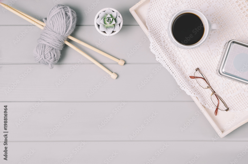 Fotografía Knitting accessories assortment background with wool and needles on gray wooden table