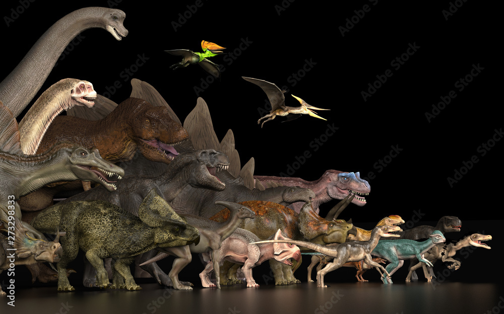Fotografía Large group of dinosaurs standing together on black floor left side view 3d rend
