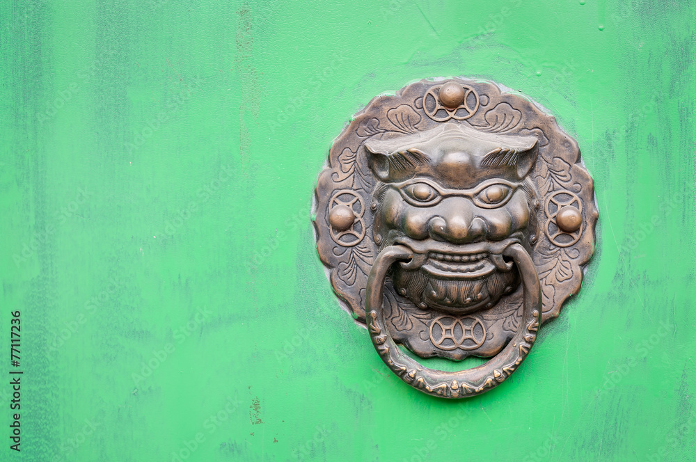 Fotografía Lion-shaped door knocker against a bright green door, China