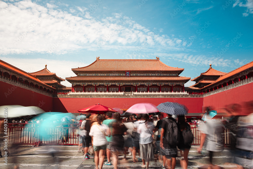 Fotografía Long exposure shot of entrance to the Forbidden city, UNESCO heritage site and crowd of tourist in Beijing, China