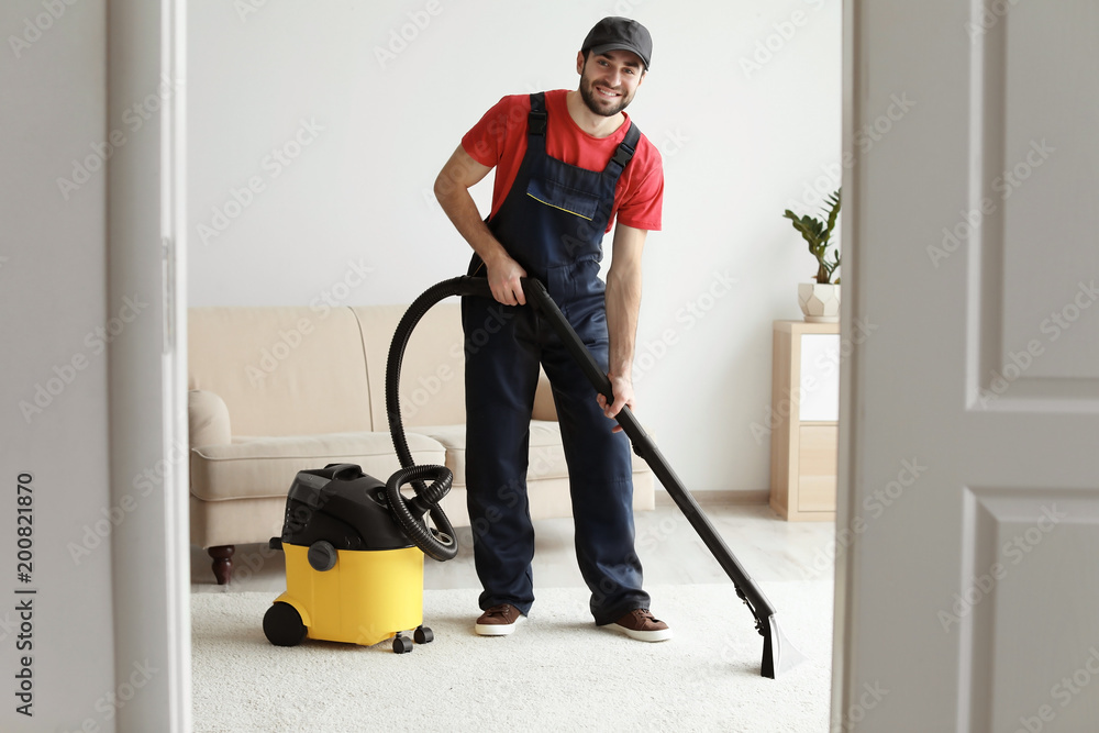Fotografía Male worker cleaning carpet with vacuum in living room
