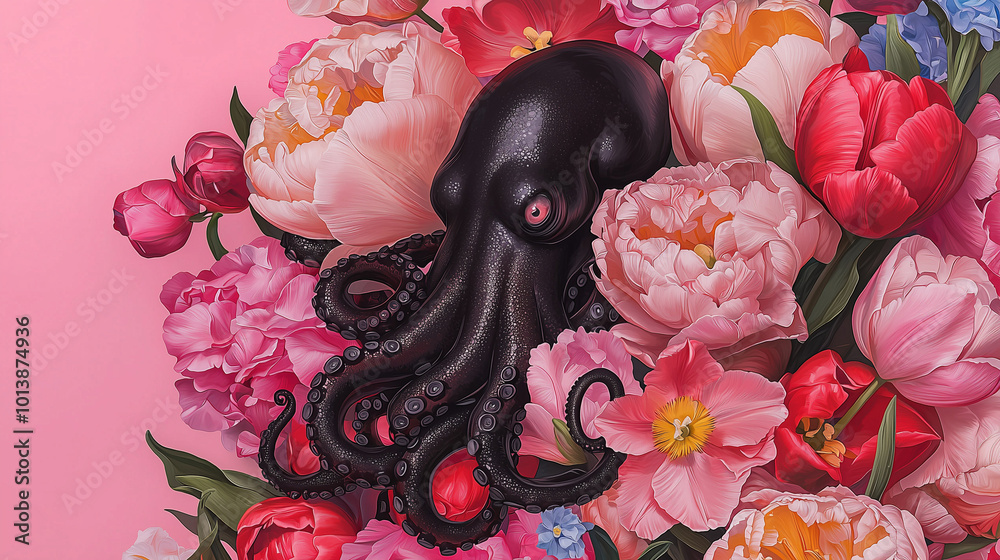 Fotografía Octopus Among Pink Flowers: A Surreal Floral Illustration