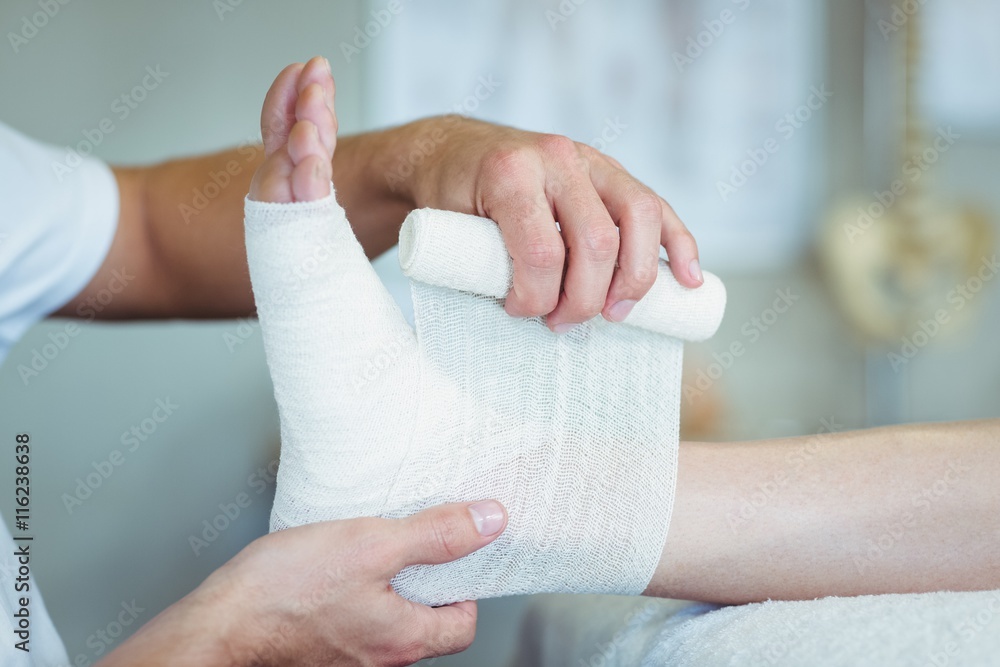 Fotografía Physiotherapist putting bandage on injured feet of patient