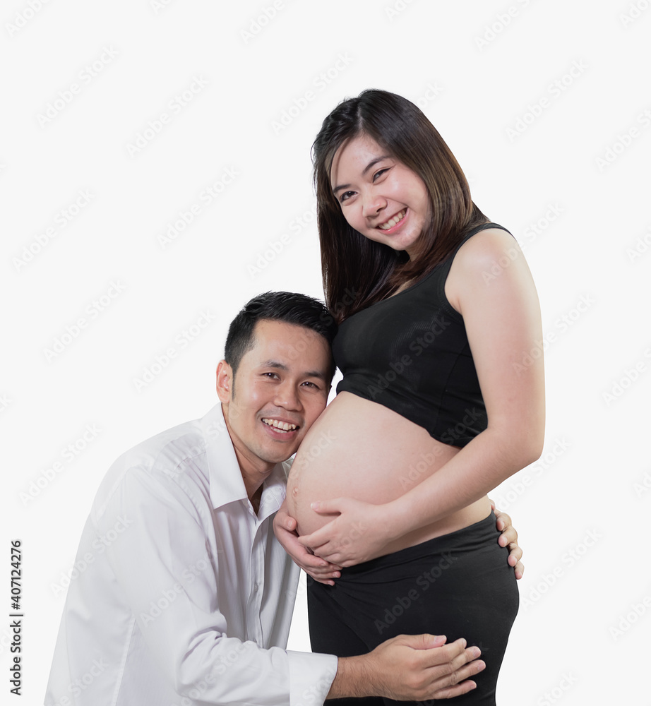 Fotografía portrait lover, husband hug his pregnant wife isolated on white background, Love