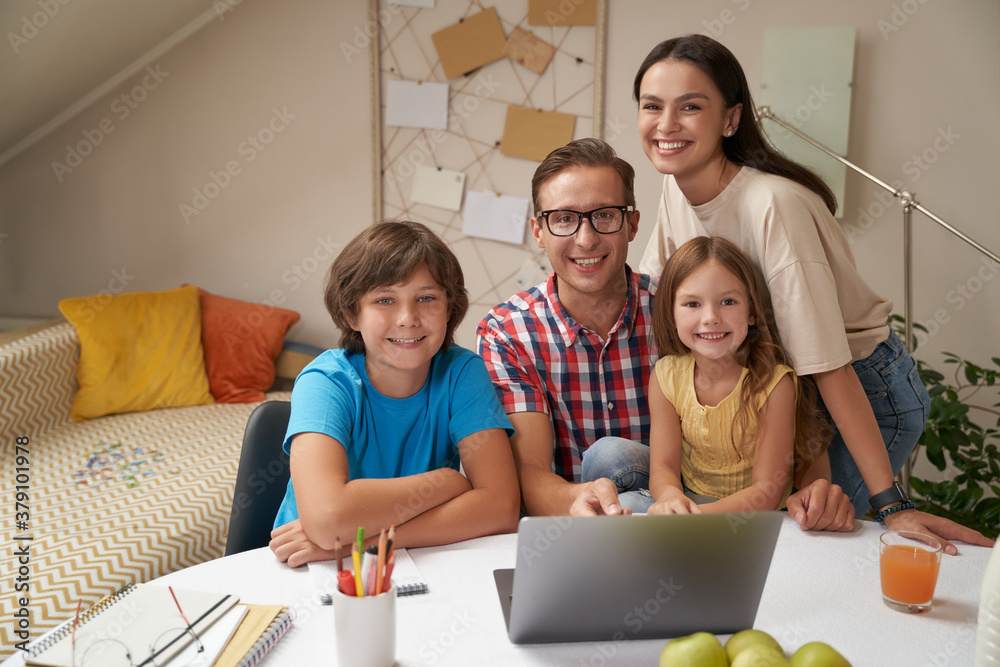 Fotografía Portrait of young happy family looking at camera and smiling while doing homewor
