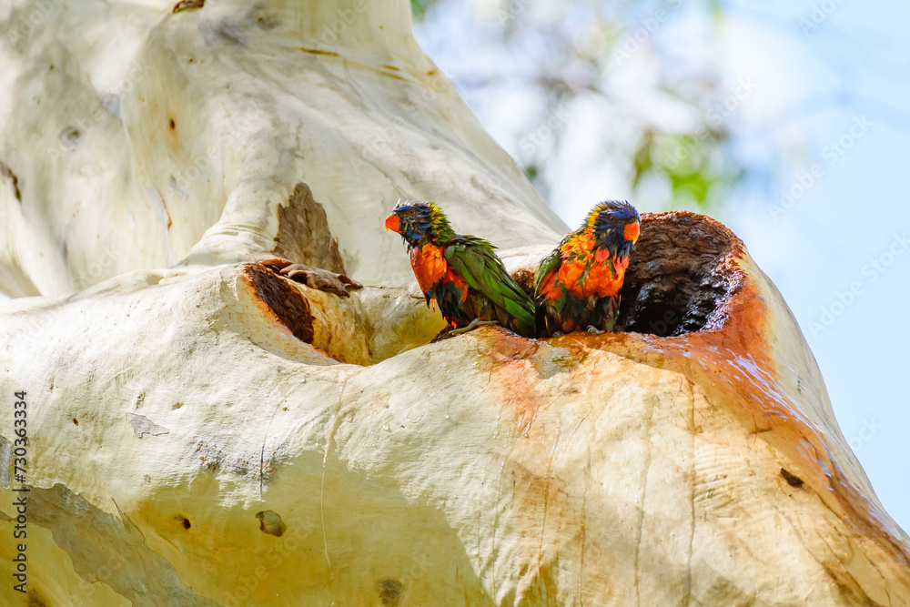 Fotografía Rainbow lorikeet (Trichoglossus moluccanus) parrot, colorful small bird, a pair of birds sits high on the trunk of a eucalyptis tree, animals wash in the water