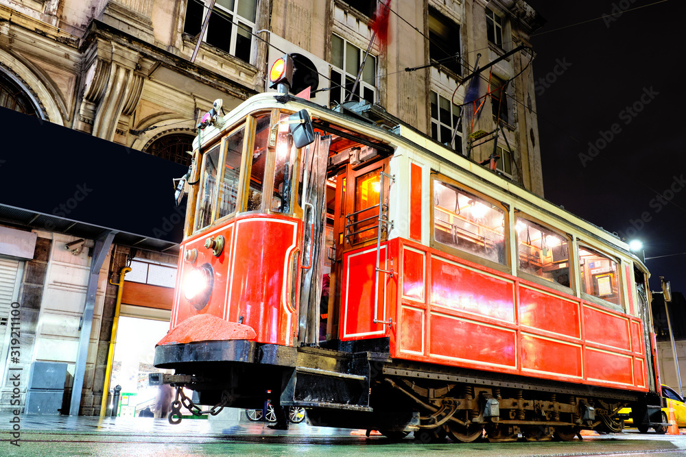 Fotografía red tram car on street of istanbul city turkey landmark at night against dark sky background