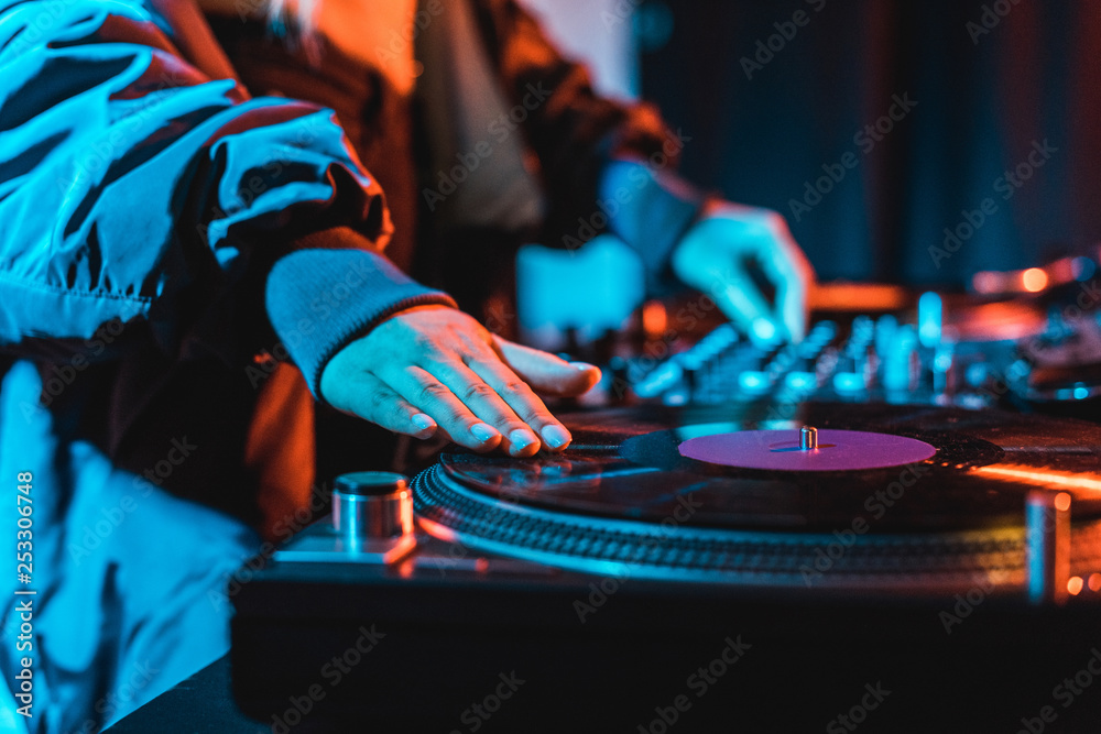 Fotografía selective focus of dj woman touching vinyl record in nightclub