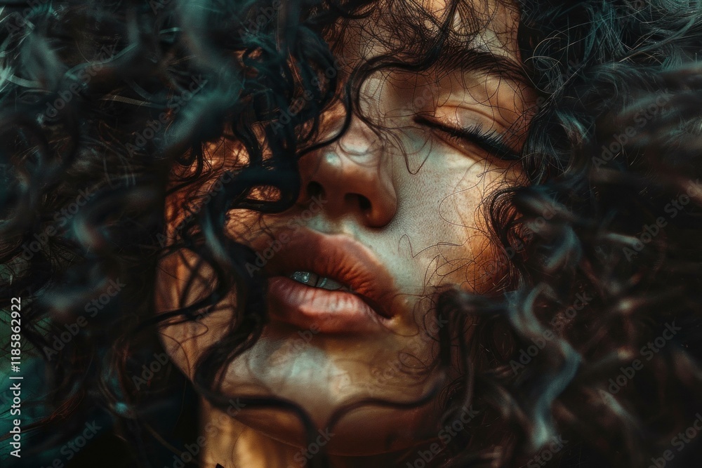 Fotografía Sensual portrait of a young woman with voluminous, curly dark hair, her eyes gen