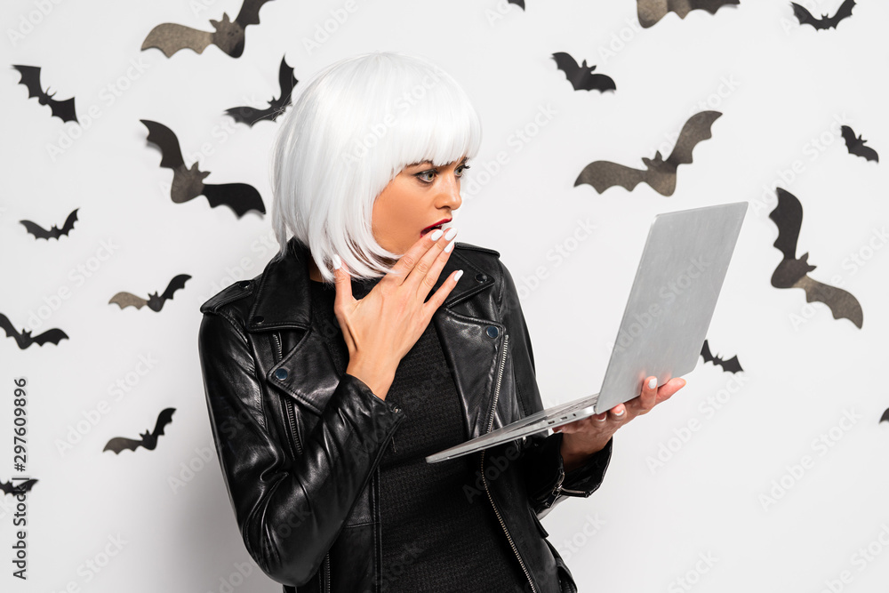 Fotografía shocked woman in white wig holding laptop in Halloween
