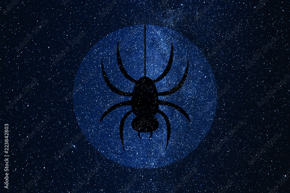 Fotografía Silhouette of spider hanging on thread against background of night sky and full moon