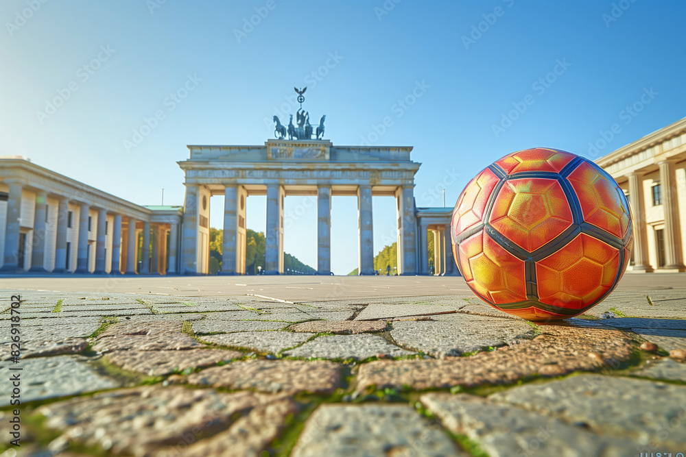 Fotografía Soccer Ball Close-Up Against Brandenburg Gate, Concept of European Football Cham