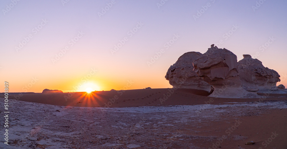 Fotografía sunrise in the white desert with the sun coming up behind the rock formations in