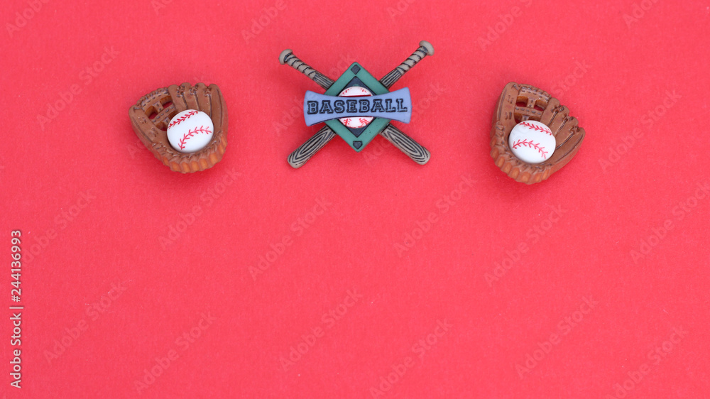 Fotografía two baseball mitts and balls next to baseball banner with bats laying flat on a