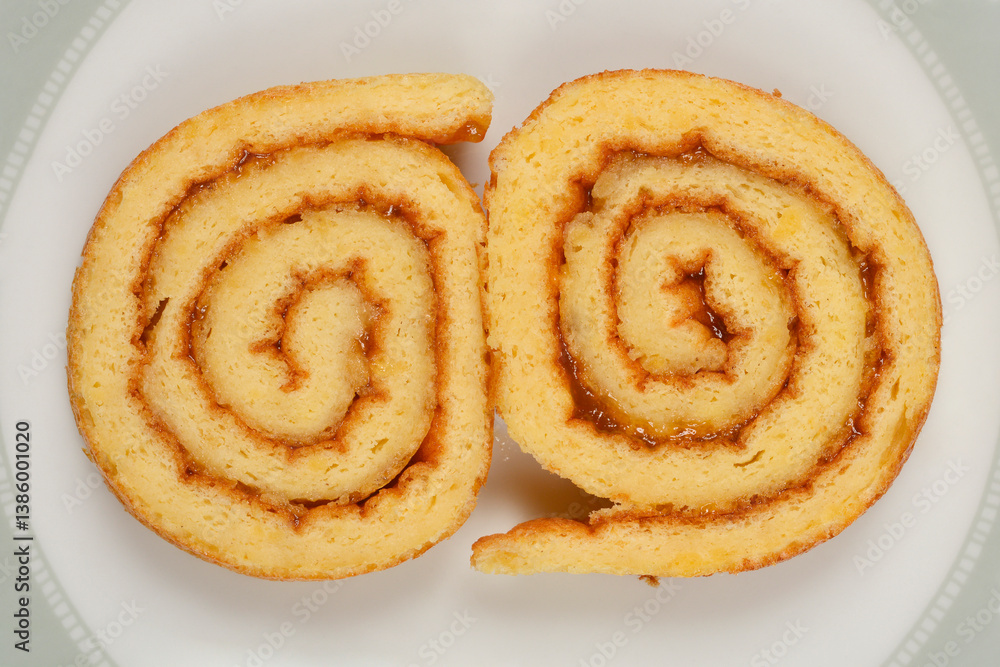 Fotografía Two slices of Swiss roll with jam filling are placed next to each other on a pla