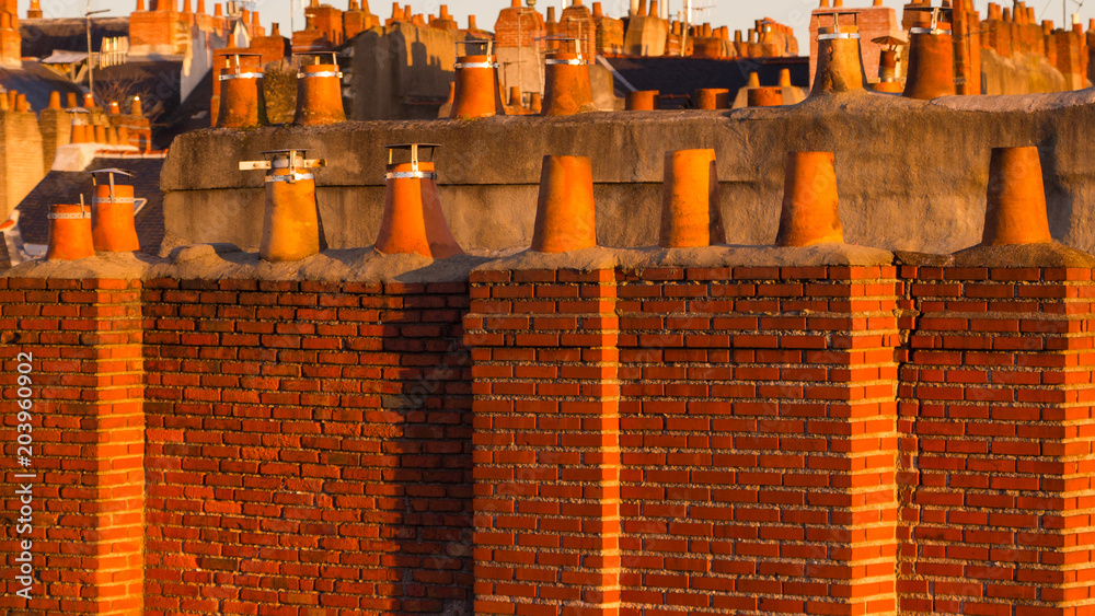 Fotografía View Across Roofscape of Redbrick and Terracotta Chimneys and Chimneypots