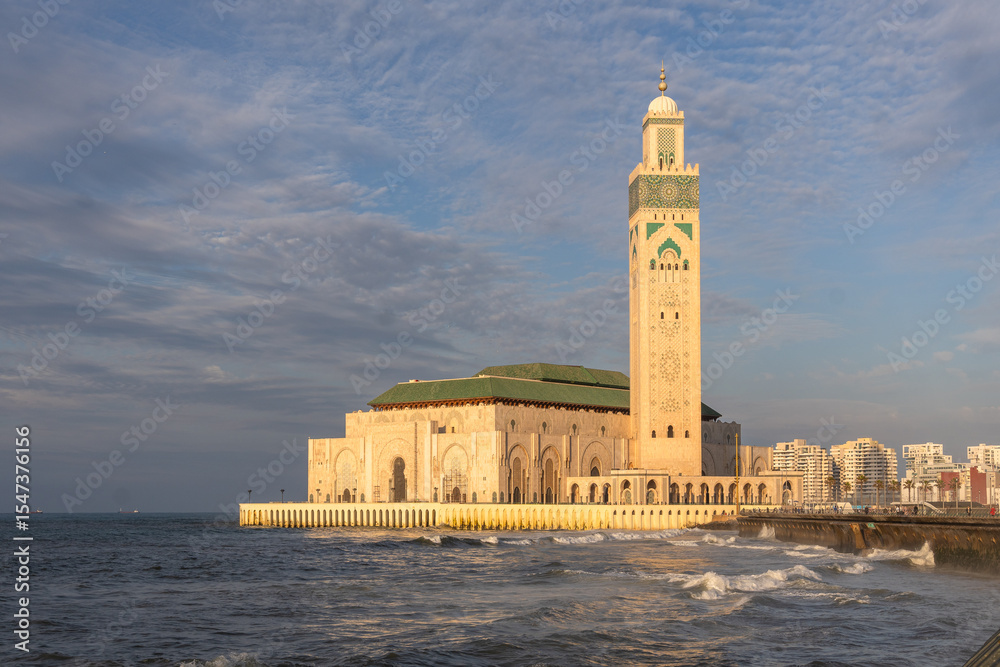 Adhesivo para pared Casablanca, Morocco: Sunset over the famous Hassan II mosque and minaret by the Atlantic ocean in Casablanca, Morocco largest city