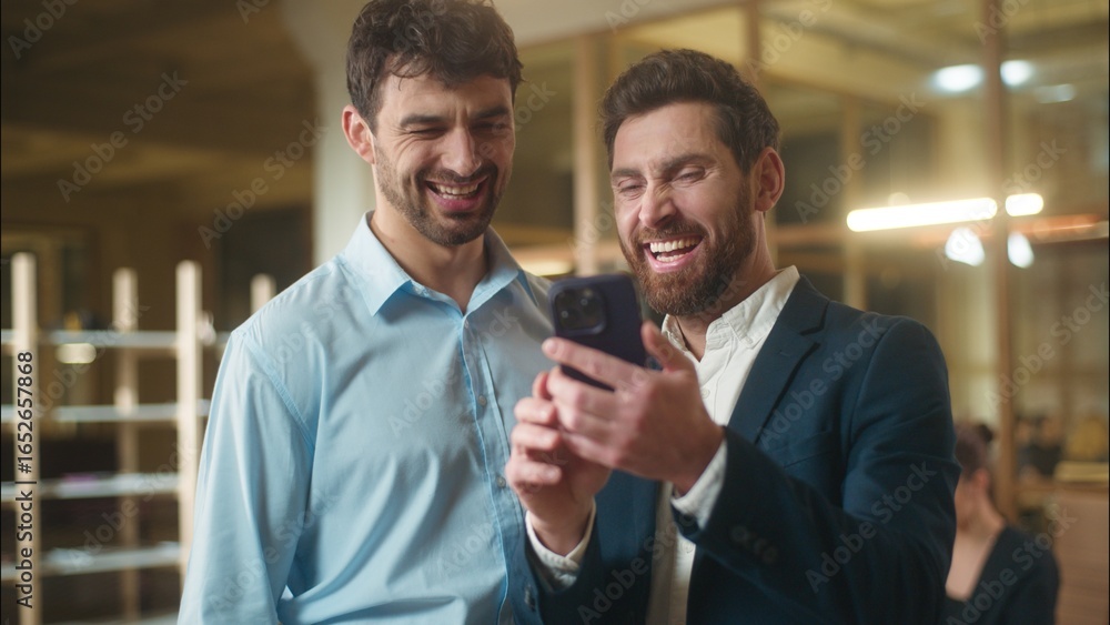 Adhesivo para pared Happy businessmen colleagues friends male business partners guys fellows Caucasi