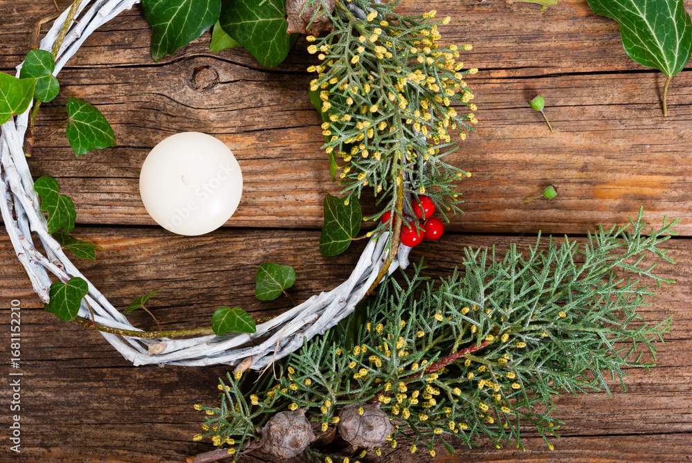 Adhesivo para pared wreath DIY, ivy, coniferous leaves, candle, string, scissors, old wooden table