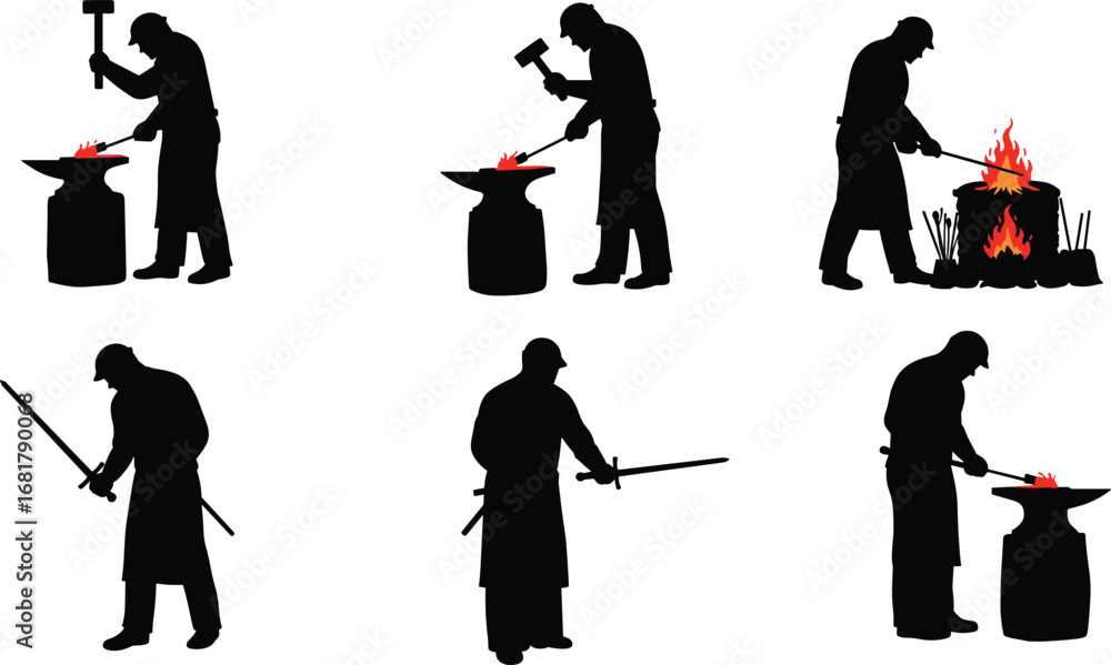 Adhesivo para pared Silhouettes of blacksmiths forging metal and swords with anvils, hammers, and fi