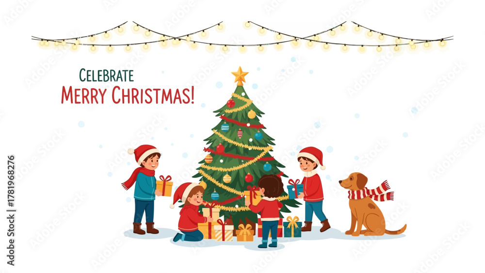 Adhesivo para pared Holiday Cheer: Animated youngsters and a friendly canine revel in the magic of the holiday, surrounded by beautifully adorned evergreen, radiant fairy lights, and thoughtfully presented gifts