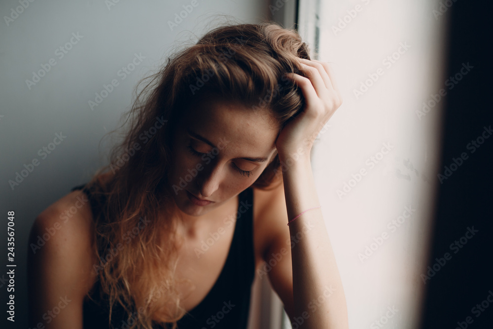 Adhesivo para pared Portrait of young beautiful woman near misted window