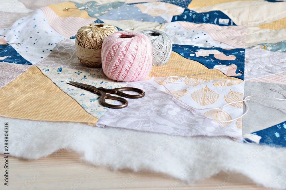 Adhesivo para pared Hand stitch quilting process: cotton thread, needle and scissors on the table