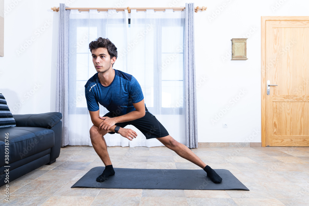Adhesivo para pared Chico joven haciendo ejercicio en casa con smartwach