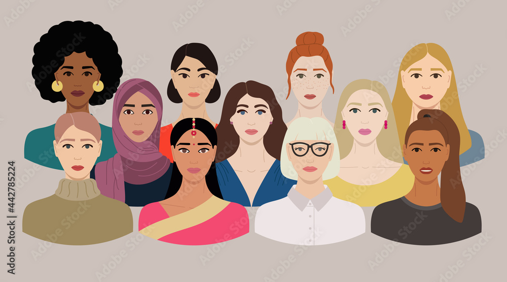Adhesivo para pared Set of diverse female faces with different ethnics, skin colors, hairstyles