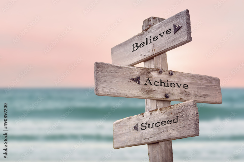 Adhesivo para pared believe achieve suceed text quote written on wooden signpost by the sea