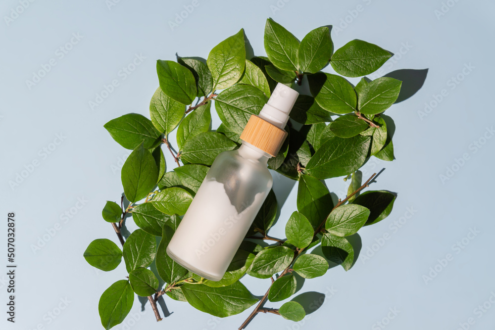 Adhesivo para pared Transparent glass cosmetic bottle with a pusher on a blue background with tropical leaves